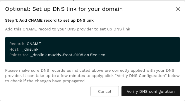 A popup will appear with directions on how to update the DNS records for DNSLink. The changes must be done through the domain registrar managing the domain, such as GoDaddy, BlueHost, HostGator, etc. The specific steps to update the records vary depending on which service you are using.