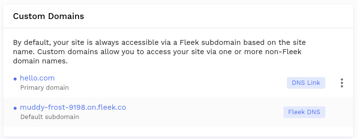 A blue chip with the text DNS Link next to the domain will indicate the successful integration of DNSLink.