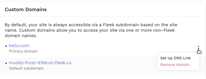 The option to set up DNSLink can be accessed by navigating from the site's Settings to Domain Management > Domains > Custom Domains and clicking on the three vertical dots.