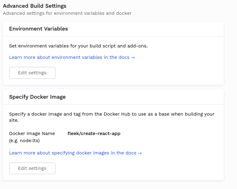 We run builds inside a Docker container. Fleek will attempt to auto-detect the framework used in the project and fill the Docker Image settings with the appropriate Docker Image. However, any Docker image from Docker Hub can be used as a Docker image.