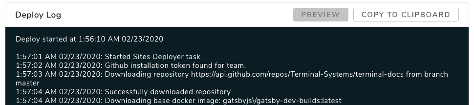 The deploy log includes all of the standard output which comes from running your build as well as Fleek-specific information about dependency caching, Fleek configuration file processing, and more.