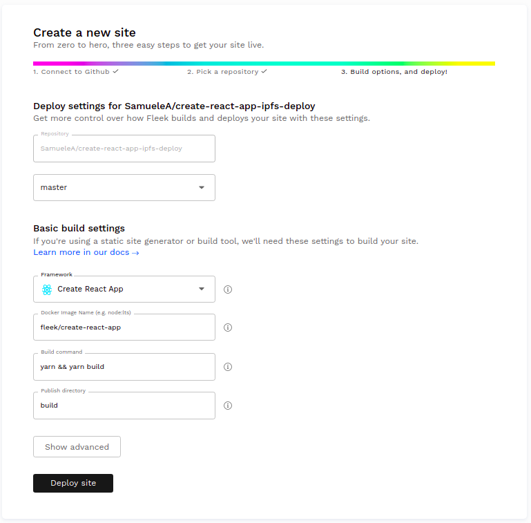 Simply set the public directory of your project to your GitHub repository and define the build command. Fleek will run the build command and deploy the result whenever you push to your Git repo. The benefits of using continuous deployment include: