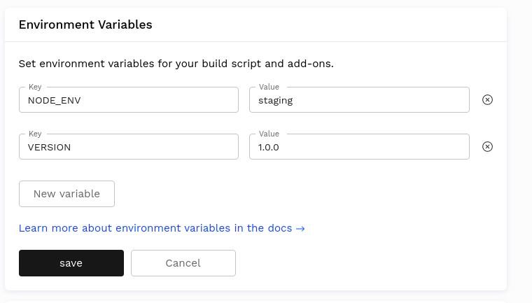 Environment variables are exactly that: variables that exist on the machine that’s running your build. You can set up any amount of environment variables by clicking the New Variable button.