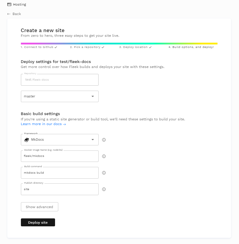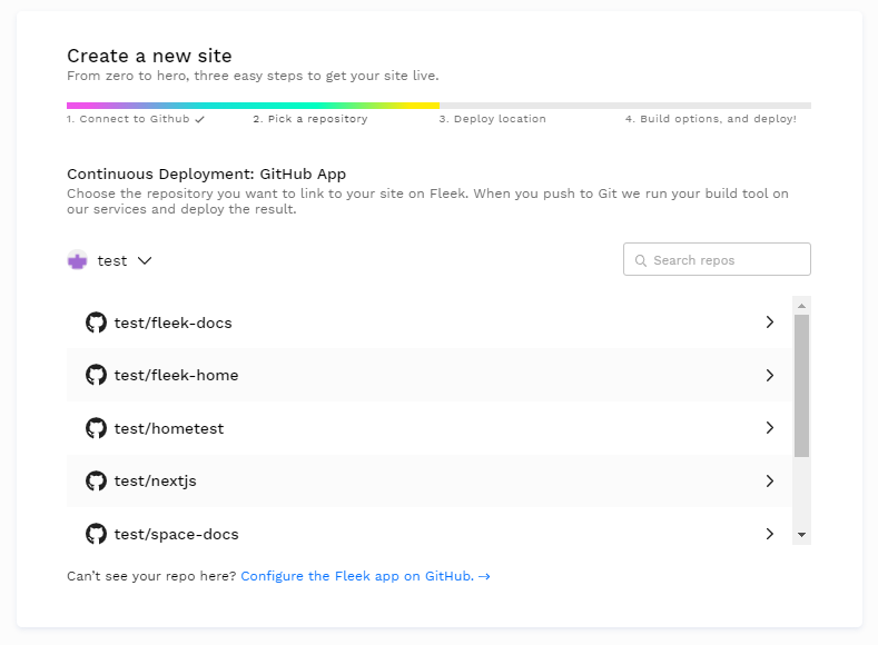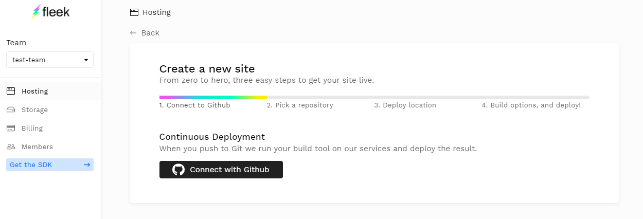 Visit the Hosting tab and add a new site to begin the process. First, you will need to link your GitHub account and define the repositories that Fleek will have access to for you to select from and deploy to the IC.