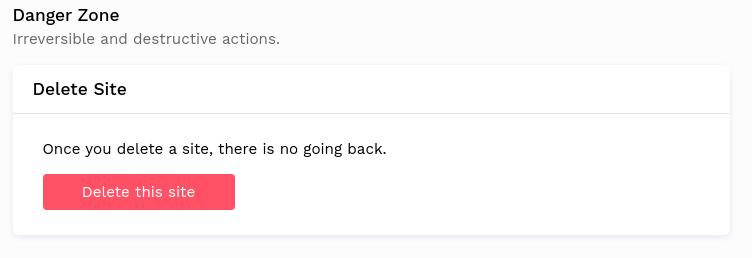 To delete a site, go to the settings of the site and navigate to General > Danger Zone. A modal will then appear with a warning and instructions to delete the site.