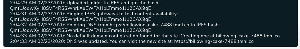 The deploy log includes all of the standard output which comes from running your build as well as Fleek-specific information about dependency caching, Fleek configuration file processing, and more.