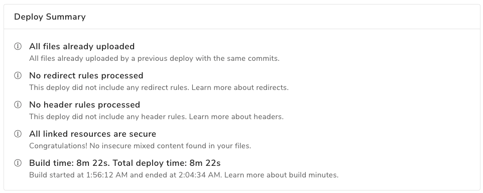 You can find a deploy summary on the detail page of any successful deploy, right above the deploy log. It allows you to quickly identify your deploy status and refer to the details in the log based on different types of information.