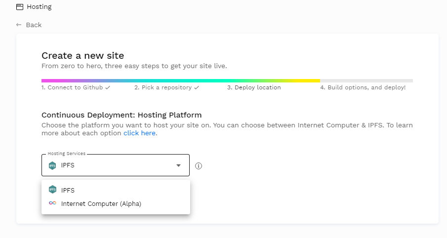 Got a repo and branch ready? Cool! Now, you will have to pick where you want to host your website. Internet Computer, or IPFS. Open the dropdown menu and select Internet Computer and hit next.