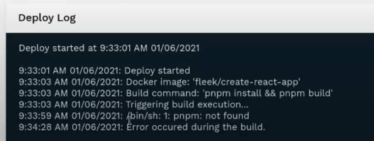 If the problem persists, you might be missing a dependency that you have locally but not on Fleek. To troubleshoot this, visit your failed deployment logs, and see if there was an element that was not found. In the example below, you can see the /bin/sh: 1: pnpm was not found.