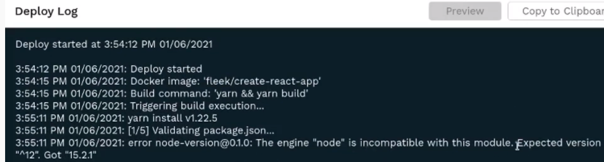 Visit your Fleek account, go into the site's details and into the failed deployment's log. There you should see an error as the following "error node-version...". In this case, it expected version 12 and got 15.2.1.