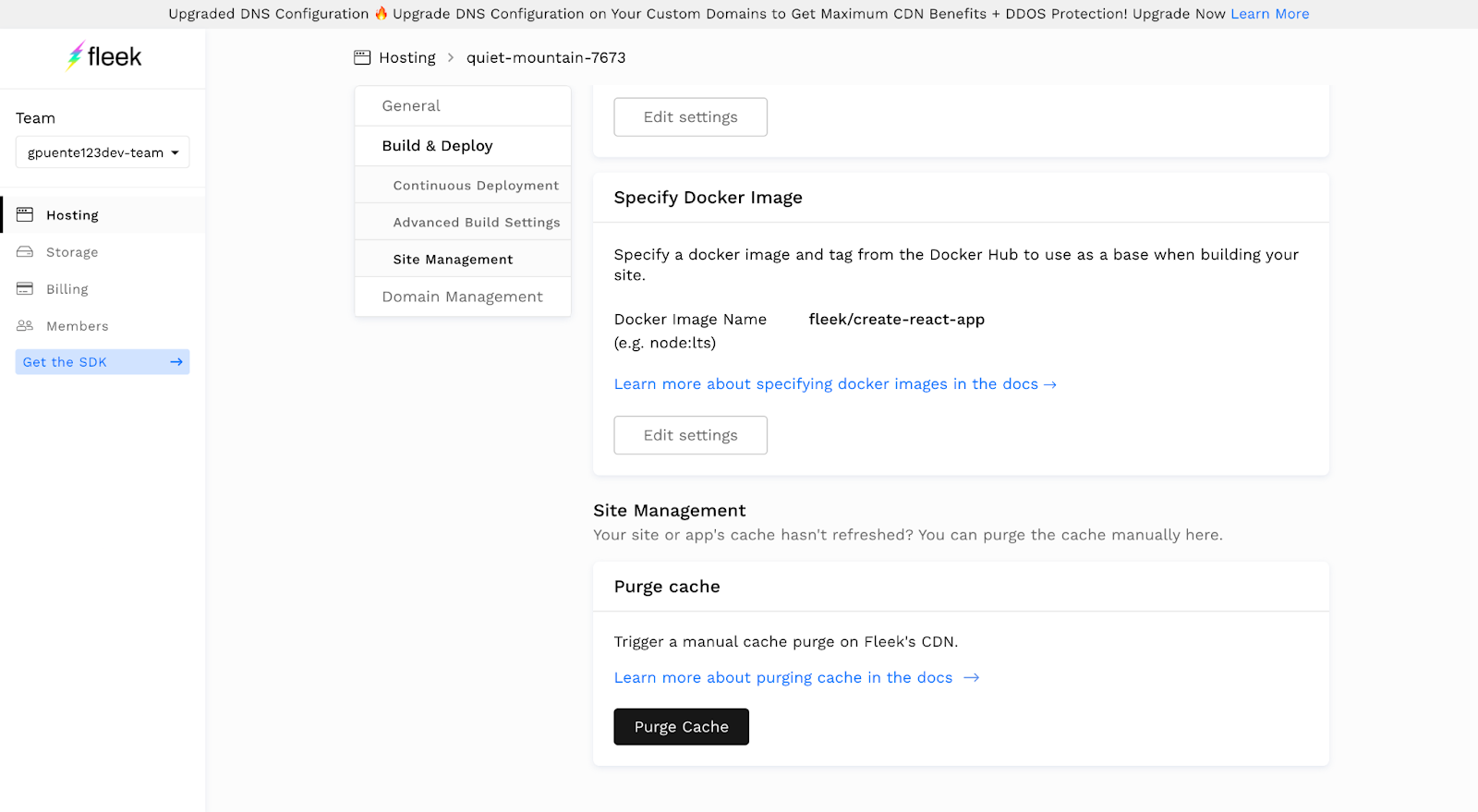 Under the hosting section in Fleek, find the affected site, and visit the Settings section in the sites details. Navigate to Build and deploy sub-menu, and find the site management and Purge Cache feature.