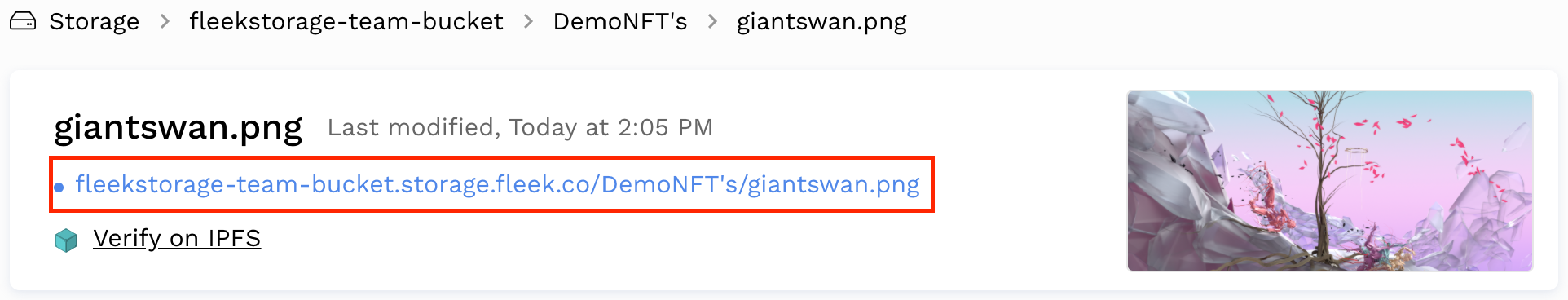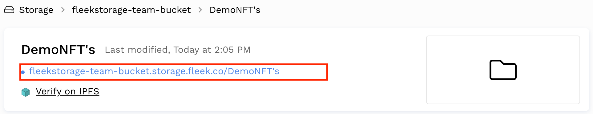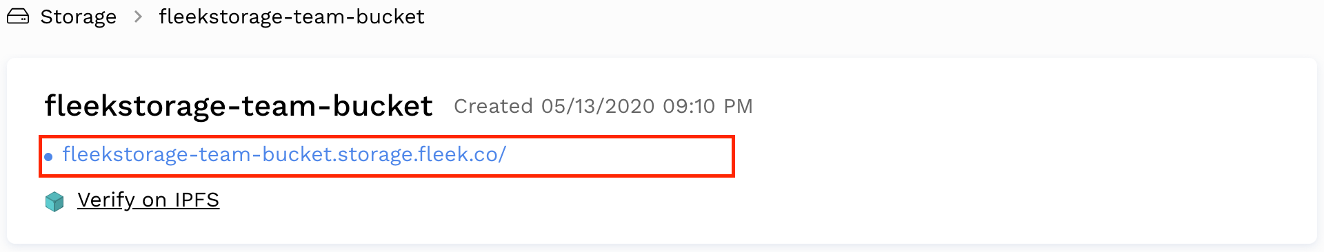 You can view your bucket, folders, or files via the Fleek Storage URL or directly on the IPFS gateway